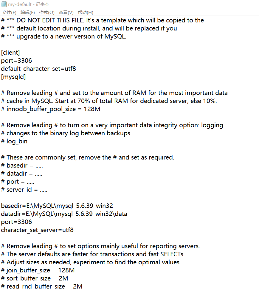 将mysql-5.6.39-win32.zip解压到指定目录中,修改my-default.ini的内容如下,并保存