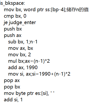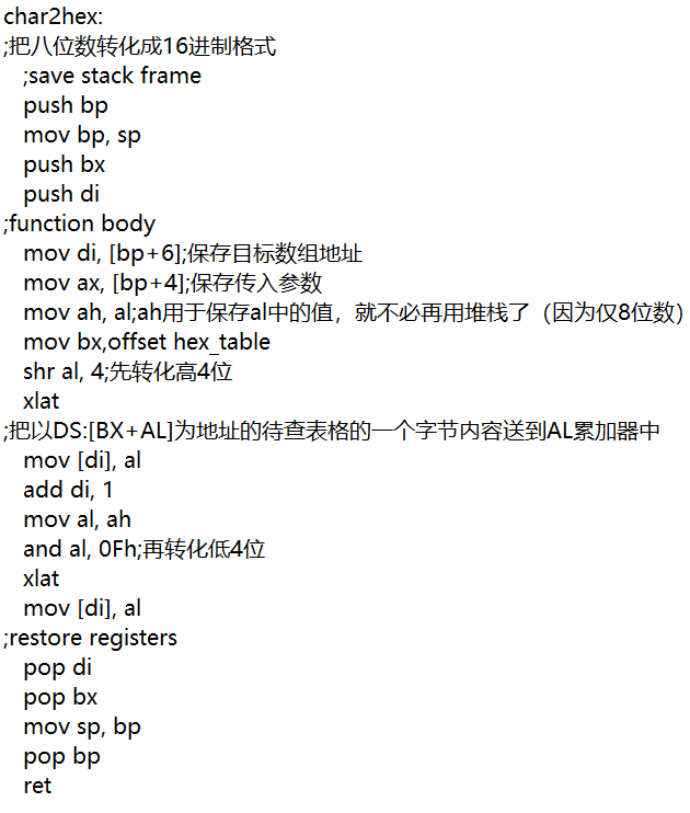 这里可以看到函数都是先push一大段再全部pop结束的,这样子就可以不影响到本来寄存器中储存的数值。在函数内部需要用到一些会影响特定寄存器的指令(比如mul,要求被乘数保存在ax中,乘数保存在bx中,得出的结果保存在ax中)时,也可以用这种方式来防止干扰。
