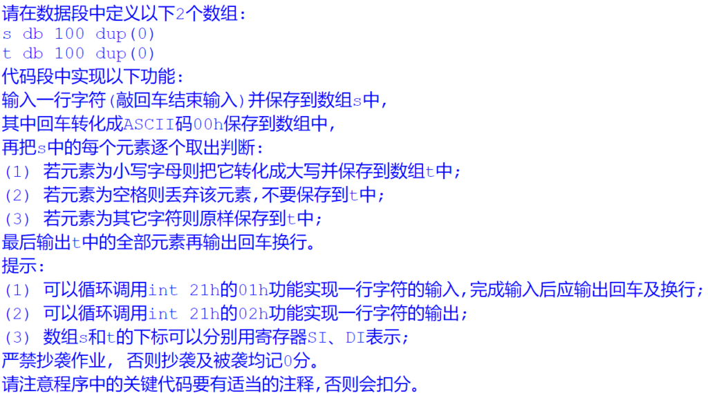 - 还是寄存器的问题。。我的室友说他们的助教强调了不能把寄存器当作变量来使用,要习惯于只使用4个及以内的寄存器数量。但是我还做不到,一开始我试图把16位寄存器的高八位和低八位分开来当作两个变量使用(就是把bl和bh分开来储存两个完全无关的值),但是这样好像时会出现一定问题的,编译的时候会出现warning,并且最后debug的时候确实验证了是寄存器这样使用导致我的输出有问题。最后我把本来使用的bh改成没有使用过的dx问题才得到解决。ax、bx、cx、dx都是16位寄存器,si、di储存偏移地址比较多,ax感觉比较多用在调用中断上面,基本也不太能用。