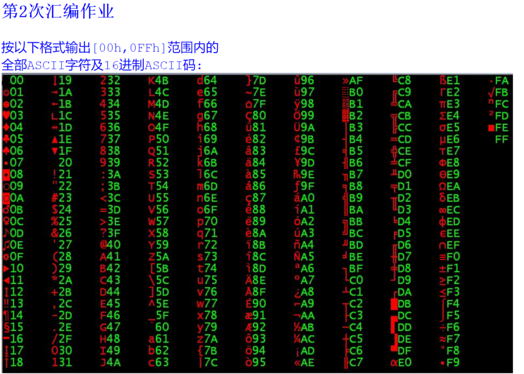 - 这次作业用到的输出方式不是int21h里面的,而是直接定位图形界面的那种,最前面mov ax,0B800h再mov es,ax定位到对应地址,然后可以用mov byte ptr es:[di],ax来直接输出了,这里di是偏移地址,al保存要输出的字符,ah保存输出字符的颜色,ah第一位是背景色,第二位是前景色。